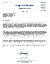 Última hora:    El Congresista Cubanoamericano Carlos Giménez solicitó al Secretario del Tesoro de los EEUU la eliminación de las remeras y los viajes a #Cuba.   En una carta al Secretario del Tesoro de los Estados Unidos , el representante al Congreso por el estado de Florida Carlos Giménez (R) le solicitó el fin del envío de remesas y los viajes desde territorio Estadounidense hacía Cuba.   En la carta Giménez expresó:    "Le escribo hoy para solicitarle respetuosamente el cese de todos los viajes hacia y desde la Cuba comunista y la eliminación de las remesas a la isla, con muy pocas excepciones humanitarias aprobadas por el Departamento de Estado. El régimen cubano está catalogado como Estado Patrocinador del Terrorismo, alberga a criminales fugitivos de la justicia estadounidense y representa una clara amenaza para la seguridad de Estados Unidos y de nuestros ciudadanos. Como usted sabe, este asunto es de gran importancia para la comunidad cubanoamericana y para millones de estadounidenses que consideran la libertad, la democracia y los derechos humanos como principios rectores.   Durante el primer mandato del presidente Trump, su liderazgo para revertir las desastrosas políticas de apaciguamiento de la administración Obama hacia el régimen cubano trajo esperanza a quienes han sufrido durante mucho tiempo bajo el régimen comunista. Las medidas de la administración Trump, en particular el endurecimiento de las restricciones a los viajes y las remesas, fueron recibidas por nuestra comunidad como una medida muy necesaria para limitar el acceso del régimen a recursos y divisas para seguir explotando y oprimiendo al pueblo cubano. Aplaudimos y celebramos las políticas más recientes de la Administración para prohibir la llegada de embarcaciones procedentes de la Cuba comunista a puertos estadounidenses, pero es necesario hacer más.   Le insto, Sr. Secretario, a que tome medidas rápidas y decisivas para detener todos los viajes hacia y desde la Cuba comunista y eliminar el flujo de remesas a la isla. La dictadura asesina en Cuba está en terapia intensiva, el régimen ni siquiera puede mantener las luces encendidas, y Estados Unidos debe apoyar al pueblo cubano para derrocar a esta patética banda de una vez por todas. Espero con interés su continuo liderazgo en este importante asunto y estoy dispuesto a trabajar con usted para garantizar que el pueblo cubano no sea abandonado en su lucha por la libertad. Ha llegado el momento."   © LaTijera