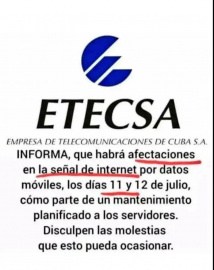 DENUNCIA CIUDADANA.   Circula por los grupos de WhatsApp y Telegram una alerta que muchos ya conocen por experiencia propia:   ¡ETECSA otra vez con el "cuento del mantenimiento"!    A medida que se acerca el aniversario del #11J, el régimen vuelve a las andadas, y sin anuncio oficial, comienzan las limitaciones y cortes del servicio de internet móvil en varias zonas del país.   No es coincidencia. Cada año, cuando se aproxima el 11 de julio, la dictadura aprieta el botón del apagón digital, temiendo que el pueblo vuelva a tomar las calles como en 2021. Prefieren silenciar al pueblo antes que permitirle expresarse.   ¿Mantenimiento programado? NO TE LO CREES NI TÚ, ETECSA.   ¡Que lo sepa el mundo! Esto no es por fallas técnicas, es por miedo al pueblo despierto.   #LaTijeraNews #ApagónDigital #CensuraEnCuba #11JCuba #NoMásDictadura #ETECSA #CubaDespierta #LibertadParaCuba #BastaDeMentiras #CastrismoEsCensura #InternetLibreYa #CubaEnDictadura #RepresiónDigital   © LaTijera