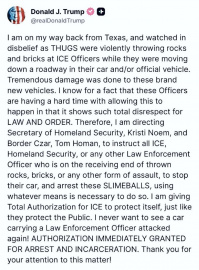 TRUMP AUTORIZA ARRESTOS INMEDIATOS TRAS ATAQUES A AGENTES DEL ICE.   El Presidente de los Estados Unidos, Donald J. Trump, lanzó un fuerte mensaje desde su cuenta en Truth Social tras presenciar un violento incidente mientras regresaba de su visita a Texas:   “Vi con incredulidad cómo unos matones lanzaban piedras y ladrillos violentamente a agentes del ICE... Sé que a estos agentes les cuesta permitir que esto suceda. Por eso, ordeno que todos los agentes que sean víctimas de agresión detengan su coche y arresten a estos inmundos, utilizando todos los medios necesarios. ¡AUTORIZACIÓN INMEDIATA PARA ARRESTO Y ENCARCELAMIENTO!”   Trump dio instrucciones directas a la Secretaria de Seguridad Nacional, Kristi Noem, y al zar fronterizo, Tom Homan, para que autoricen a los agentes del ICE, del DHS y de cualquier cuerpo de orden público a actuar con firmeza ante cualquier ataque.   Puntos claves del mensaje presidencial:   Condena total a los ataques contra autoridades federales.   Daño severo a vehículos oficiales del ICE.   Orden directa para arrestar y encarcelar a los agresores sin demora.   Autorización plena al uso de la fuerza necesaria para defensa.   Este mensaje se suma al tono enérgico que ha tomado Trump en temas de seguridad fronteriza, especialmente tras las inundaciones en Texas y la creciente tensión en zonas cercanas a la frontera.   Desde La Tijera News estaremos siguiendo de cerca la respuesta de ICE y del Departamento de Seguridad Nacional en las próximas horas.   #Trump #ICE #Inmigración #OrdenYLey #FronteraSur #KristiNoem #TomHoman #SeguridadNacional #TruthSocial #LaTijeraNews #PresidenciaTrump   © LaTijera