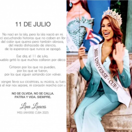 Lina Luaces, Miss Universe Cuba 2025, envía emotivo mensaje al Pueblo Cubano por el 11 de Julio.   En el 4to Aniversario del Estallido Social del 11 de Julio de 2021, Lina Luaces Estefan, representante de Cuba en Miss Universe 2025 e hija de la reconocida presentadora Lili Estefan, alzó su voz con un mensaje contundente al pueblo cubano.   "No nací en la isla, pero la isla nació en mí..." así comienza su poderoso mensaje que honra la valentía del pueblo cubano y la memoria de quienes gritaron “¡Libertad!” aquel histórico día.   Lina expresó:   “No nací en la isla, pero la isla nació en mí. Crecí escuchando historias que no caben en libros: del calor que quema pero también abraza, del miedo disfrazado de silencio, de la esperanza que nunca se apagó.   Ese día, el 11 de julio, mi pueblo gritó lo que muchos callaron por décadas.   Gritaron por los que no pueden, por los que se fueron, por los que siguen soñando con volver.   Mi sangre lleva sus cicatrices, su música, su fuerza. Aunque el mar nos separe, mi corazón marcha con ustedes.   NO SE OLVIDA. NO SE CALLA. PATRIA Y VIDA. SIEMPRE.   — Lina Luaces MISS UNIVERSE CUBA 2025”   Desde el exilio, una nueva generación de voces cubanas no olvida sus raíces… y no se calla.   ¡Comparte este mensaje con el mundo!   (De una publicación de Yusnabi Pérez)   #PatriaYVida #11J #CubaDespierta #MissUniverseCuba #LinaLuaces #LiliEstefan #CubaLibre #NoSeOlvida #SomosLaVozDelPueblo #Cuba #11J2021 #LaTijeraNews #CubaNoEstáBloqueadaEstáSaqueada   © LaTijera