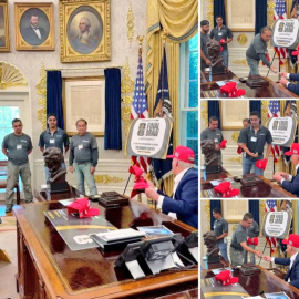 Washington D.C.   El Presidente de los Estados Unidos, Donald J. Trump, tuvo un gesto de cercanía y agradecimiento con los obreros que actualmente trabajan en la renovación de la Casa Blanca.   El mandatario los invitó a la histórica Sala Oval, donde compartió un momento de diálogo y fraternidad. Como muestra de reconocimiento a su labor, les entregó gorras MAGA y una medalla de su Presidencia.   Un gesto simbólico que refleja la importancia del trabajo y el esfuerzo de los hombres y mujeres que contribuyen al mantenimiento de uno de los edificios más emblemáticos del país.   #DonaldTrump #CasaBlanca #SalaOval #MAGA #EstadosUnidos #PresidenciaTrump #LaTijeraNews #WashingtonDC #TrabajadoresAmericanos #WhiteHouse   © LaTijera