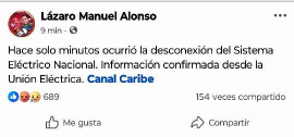 Último Minuto: El Sistema Electroenergético Nacional de Cuba sufrió una desconexión Total.   El vocero Mediático de la Dictadura Castrista Lázaro Manuel Alonso acaba de anunciar hace unos minutos la Desconexión Total del Sistema Electroenergético Nacional del País.   El Régimen Castrista está hundido, lo único que falta es que el pueblo Cubano se lance a las Calles a exigir #Libertad sino tendrán que soportar vivir en la Oscuridad y la Miseria 66 mil años más.   #CubaPaLaCalle #CubaEnApagon #SEN  #ApagonTotal #SOSCuba #AbajoLaDictadura  #PatriayLibertad    © LaTijera