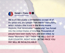 URGENTE: TRUMP ADVIERTE A NICOLÁS MADURO   El Presidente de los Estados Unidos, Donald J. Trump, lanzó una advertencia directa al Narcodictador de Venezuela, Nicolás Maduro:    “Queremos que Venezuela acepte de inmediato a todos los prisioneros y personas de instituciones mentales, incluidos los peores manicomios del mundo, que el ‘liderazgo’ venezolano ha obligado a ingresar a los Estados Unidos de América.   Miles de personas han resultado gravemente heridas e incluso asesinadas por estos ‘Monstruos’.   ¡SAQUENLOS DE NUESTRO PAÍS, AHORA MISMO, O EL PRECIO QUE PAGARÁN SERÁ INCALCULABLE!”    Esta declaración aumenta la tensión entre Washington y Caracas en medio del flujo masivo de inmigrantes y el debate sobre seguridad nacional en la frontera sur de EE.UU.   #LaTijeraNews #DonaldTrump #Trump2025 #USA #Venezuela #NicolasMaduro #Narcodictadura #Inmigración #SeguridadNacional #BreakingNews #ÚltimaHora #NoticiasUSA #LaTijera   © LaTijera
