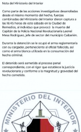 ÚLTIMA HORA | Capturado presunto responsable de la muerte del Capitán de la PNR "Cal Viva"   En menos de 48 horas, el MININT informó la captura del ciudadano señalado como autor de la muerte del Capitán de la PNR Leonel Mesa Rodríguez, alias “Cal Viva”, jefe de sector en el municipio Caibarién, Villa Clara.   Nota oficial del MININT:   La detención se realizó a las 16:45 horas de este sábado, en la ciudad de Remedios.   Al detenido se le ocupó el arma reglamentaria con su cargador, perteneciente al oficial fallecido, y el arma blanca utilizada en el hecho.   Será sometido a proceso penal “con el rigor que establece la justicia revolucionaria”, según la nota.   Contexto y testimonios desde Remedios:   Vecinos relatan que el arrestado es un hombre de pelo rubio, barbudo y harapiento, conocido en la zona como limosnero. Testigos presenciales aseguran que la detención se produjo frente a la funeraria, con participación de la policía y dos oficiales de civil en una moto, quienes se abalanzaron sobre él cuando intentó sacar un cuchillo.   En el operativo, se le ocupó la pistola de “Cal Viva” escondida en una de sus botas. Según los presentes, el arrestado recibió una fuerte golpiza antes de ser trasladado.   Los vecinos señalan que el detenido era “un pobre diablo”, víctima de los abusos y hostigamiento del propio Mesa Rodríguez, conocido por su historial de represión y violencia contra la población del Consejo Popular La Reforma.   Mientras la PNR se ufana de dar por terminada en tiempo récord la captura de este sujeto, mantiene cientos de casos de homicidios sin resolver, simplemente porque las víctimas no eran uno de los suyos.   #ÚltimaHora #VillaClara #Remedios #PNR #Represión #DerechosHumanos #NoticiasCuba #LaTijeraNews #Cuba #JusticiaCuba #Caibarién #Impunidad   © LaTijera