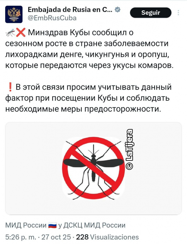 ÚLTIMA HORA | ALERTA SANITARIA EN CUBA, EMBAJADA RUSA EN LA HABANA EMITIÓ UNA ALERTA A SUS CIUDADANOS EN LA ISLA.   La Embajada de la Federación Rusa en La Habana emitió una alerta sanitaria dirigida a sus ciudadanos que residen o visitan la isla.   Según el comunicado, el Ministerio de Salud de Cuba (MINSAP) reportó un aumento estacional de casos de dengue, chikungunya y oropouche, enfermedades transmitidas por la picadura de mosquitos infectados.   La representación diplomática recomienda a los turistas rusos tomar medidas de precaución como:   Evitar zonas con agua estancada.   Usar repelentes antimosquitos.   Vestir ropa que cubra brazos y piernas, especialmente al amanecer y al anochecer.   El Ministerio de Asuntos Exteriores de Rusia (MID) hizo un llamado a extremar la vigilancia sanitaria ante la situación epidemiológica en Cuba.   #LaTijeraNews #Cuba #Rusia #Dengue #Chikungunya #Oropouche #Salud #Mosquitos #AlertaSanitaria #EmbajadaRusa #NoticiasCuba #ÚltimaHora   © LaTijera