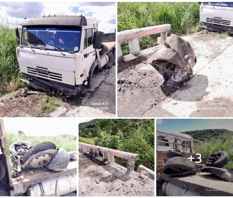 Accidente de Tránsito ayer en la noche en la Autopista Nacional de Cuba.   Un Accidente de Tránsito ocurrió ayer en la noche en le kilómetro 285 de la Autopista Nacional de Cuba.   Según testigos, al camión se le explotó un neumático (delantero derecho) haciendo que el chófer perdiera el control, terminando encarnado sobre el puente.   Afortunadamente solo hubo daños materiales, sin lesionados ni pérdidas humanas.   (De la página Accidentes de buses y camiones)   © LaTijera
